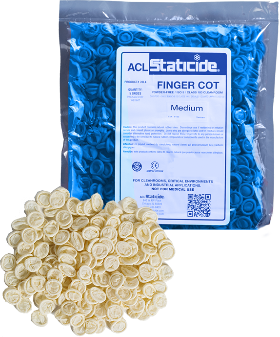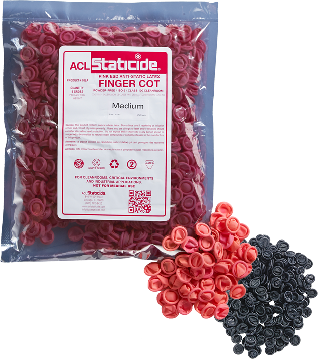 ACL’s Staticide Latex and Nitrile ESD Finger Cots provide employees with effective and durable safety gear to help create a static-safe work area whether the application is for electronics or controlled environment manufacturing applications. Staticide ESD Finger Cots are an excellent choice for laboratories, precision optics, IC/disk drive manufacturing, electronics assembly and packaging.